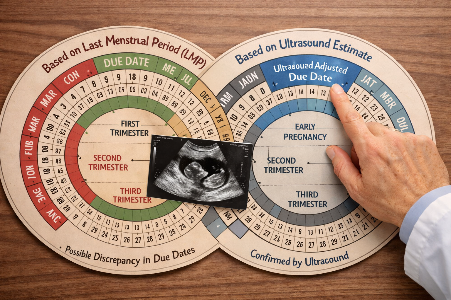 • Discrepancies between ultrasound estimates and Last Menstrual Period (LMP) dates are common, especially with irregular cycles.
