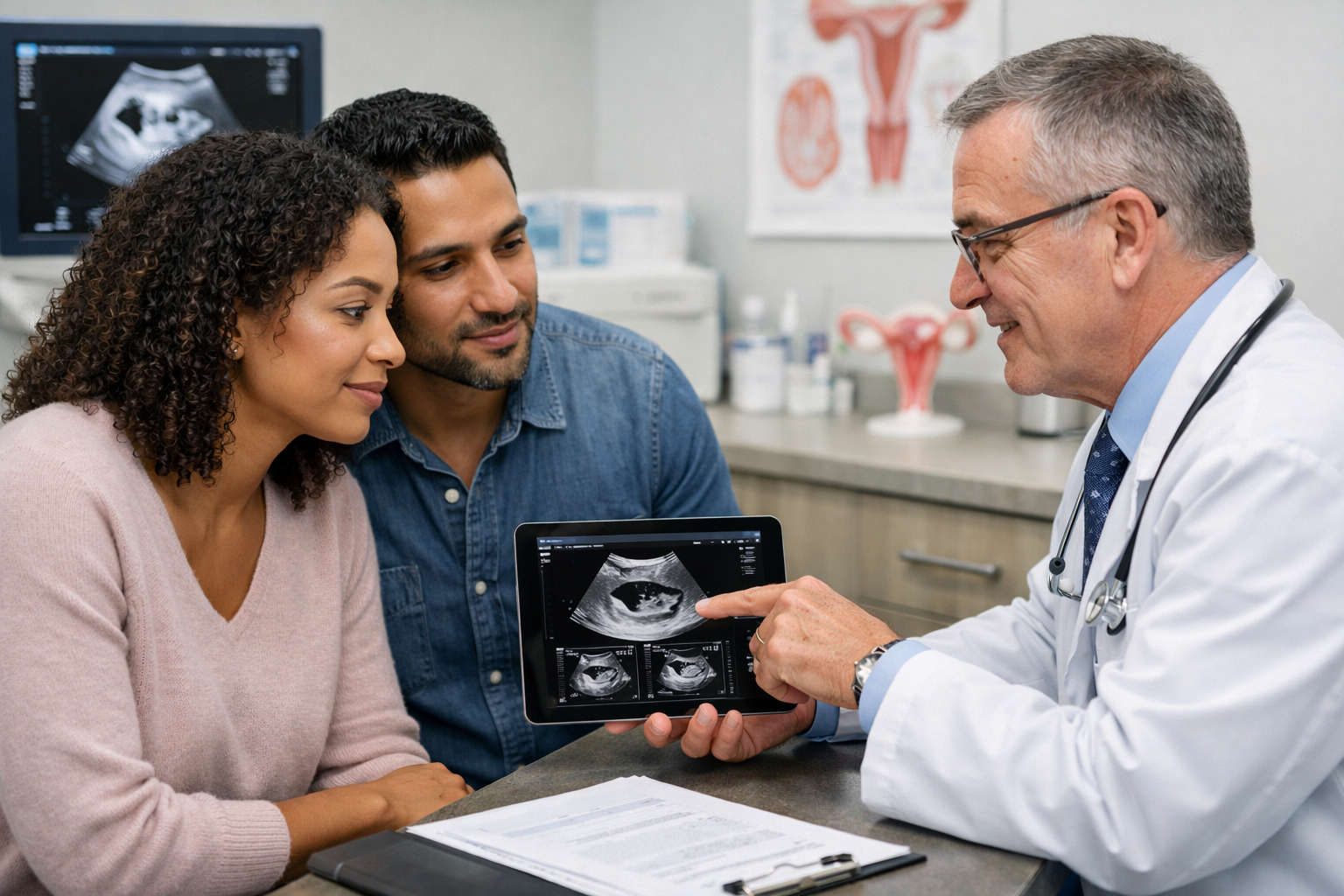 Detailed () image with a professional medical setting, showing a diverse couple consulting with a doctor who is reviewing