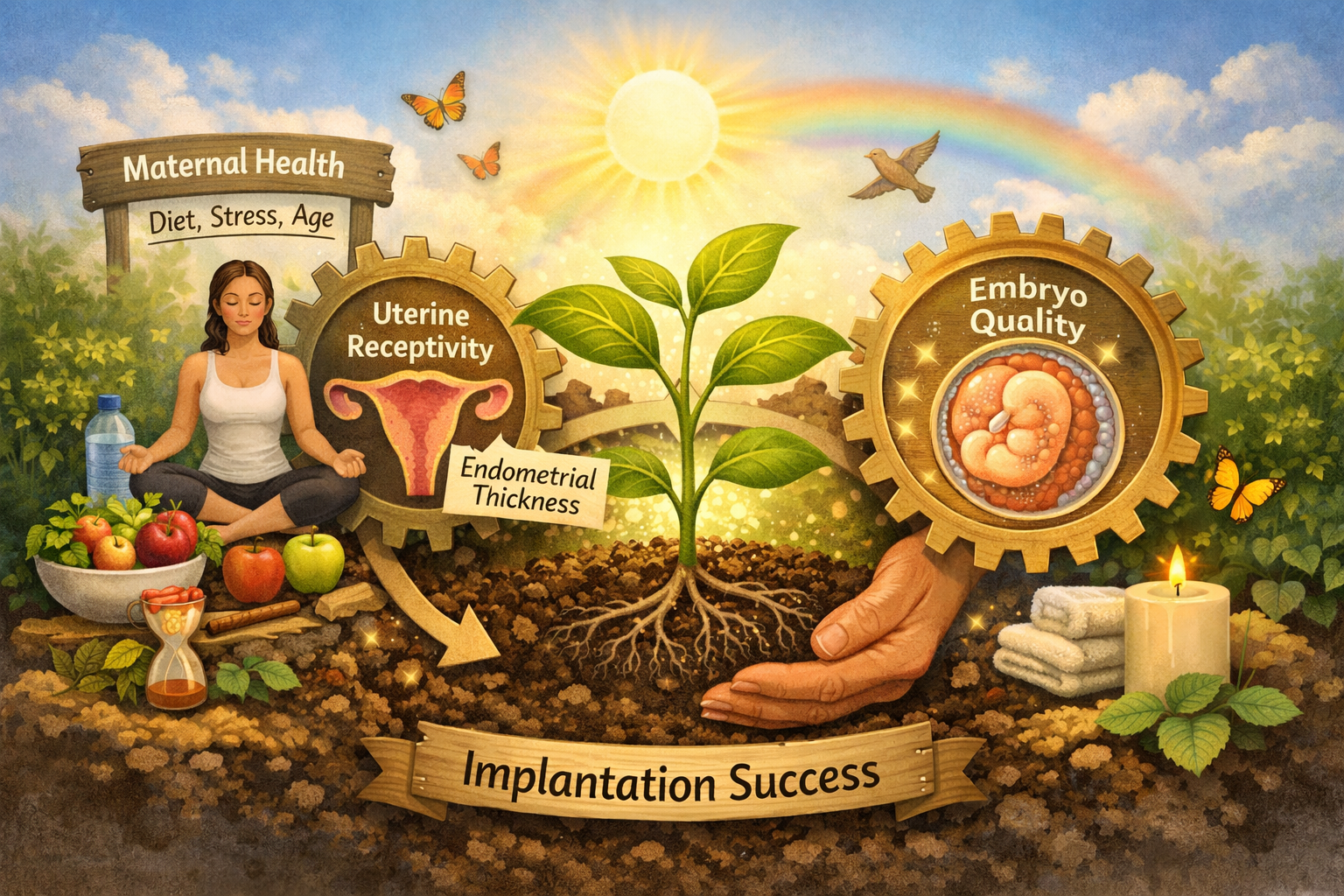 A conceptual image showing various factors that can influence implantation success, such as maternal health (diet, stress,