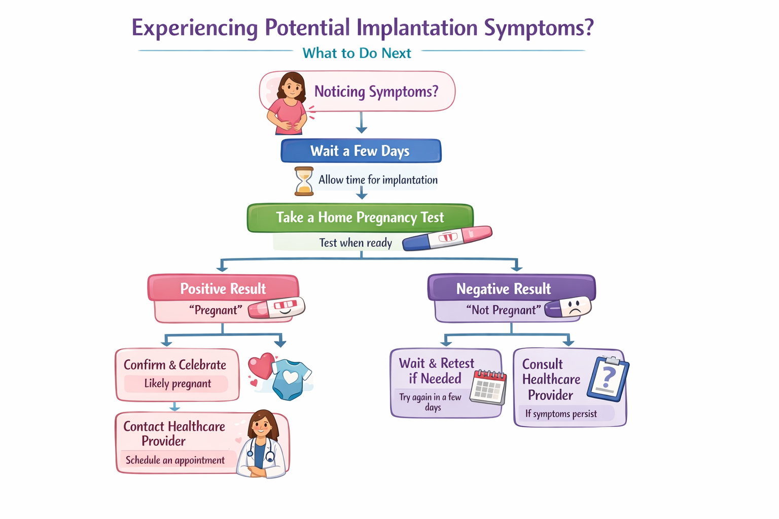 Flowchart for steps after potential implantation symptomshttps://zsxkvszxbhpwnvzxdydv.supabase.co/storage/v1/object/public/generated-images/kie/a8f53e10-3475-478d-84b2-1db39edc7bf0/slot-5-1772791803663.png